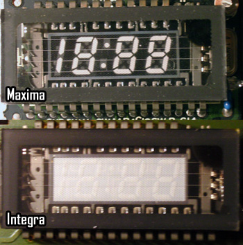My answer has finally come, and the moment of epiphany happened when I recently rode in a 92 Integra, and saw how similar its clock was to ours, but with white digits. Same country of origin, same time period, possibly the same automotive electronic supplier. I decided it was worth the $10 gamble, and picked up a clock on eBay. The display looks identical to ours, I'm waiting until replacement capacitors arrive in the mail, and then I will transfer the Integra display to the spare Maxima clock I have. Here is a photo to hold you all over until the soldering begins: