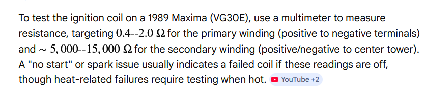 If the timing belt isn't broken that's a good sign, have you checked all of the fuses & fusible links? You can try Ohm testing the ignition coil as well, generic AI search gives the below specs