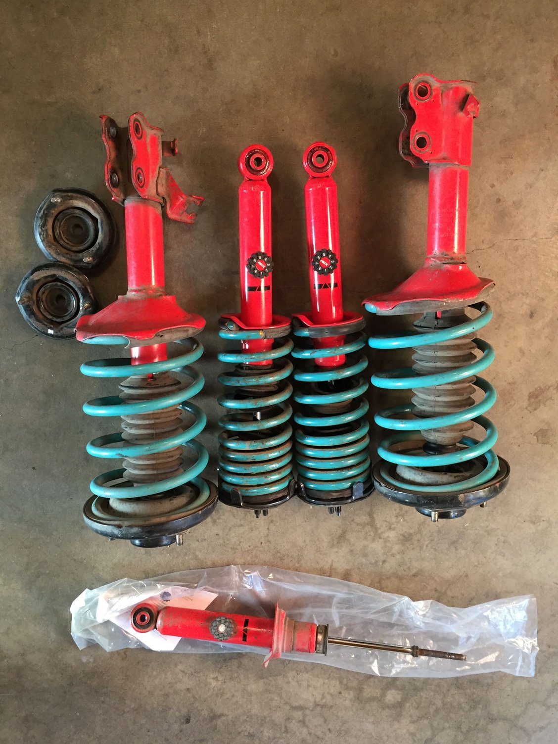 I'm selling a full suspension which consist of KYB/AGX fully adjustable struts and shocks. Struts have about 10k miles on them. The rear shocks are new, about 500 miles on them. Progress springs and MEP mounts for the rear(they add about 1/2 in more travel for smoother ride) you will also get the stock mounts if needed. I'm also throwing in an extra shock. These are plug and play. The only reason I bought new rear ones was because I had to grind off a nut from the one of the original ones basically killing it. SOLD. I'd prefer local pick-up, because these things are super heavy, but will ship. I'm also willing to separate things if I have buyers. If you have any questions, let me know. Thanks....
