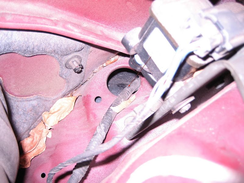 I used this hole when I was wiring up my amp and 00VI. It leads to above the gas pedal. All I had to do was remove the rubber grommet and feed the wire through. This is not my car, but here is a picture of it: