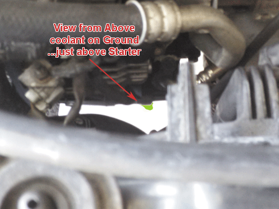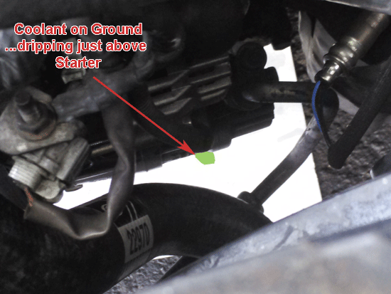 This morning, while the CAR WAS COLD, i attached A pressure Gauge to the Radiator to see what reading i would get. I pumped it to 20, and waited for 30 mins and got a leak on the ground, COMING FROM, just above the Starter Motor.