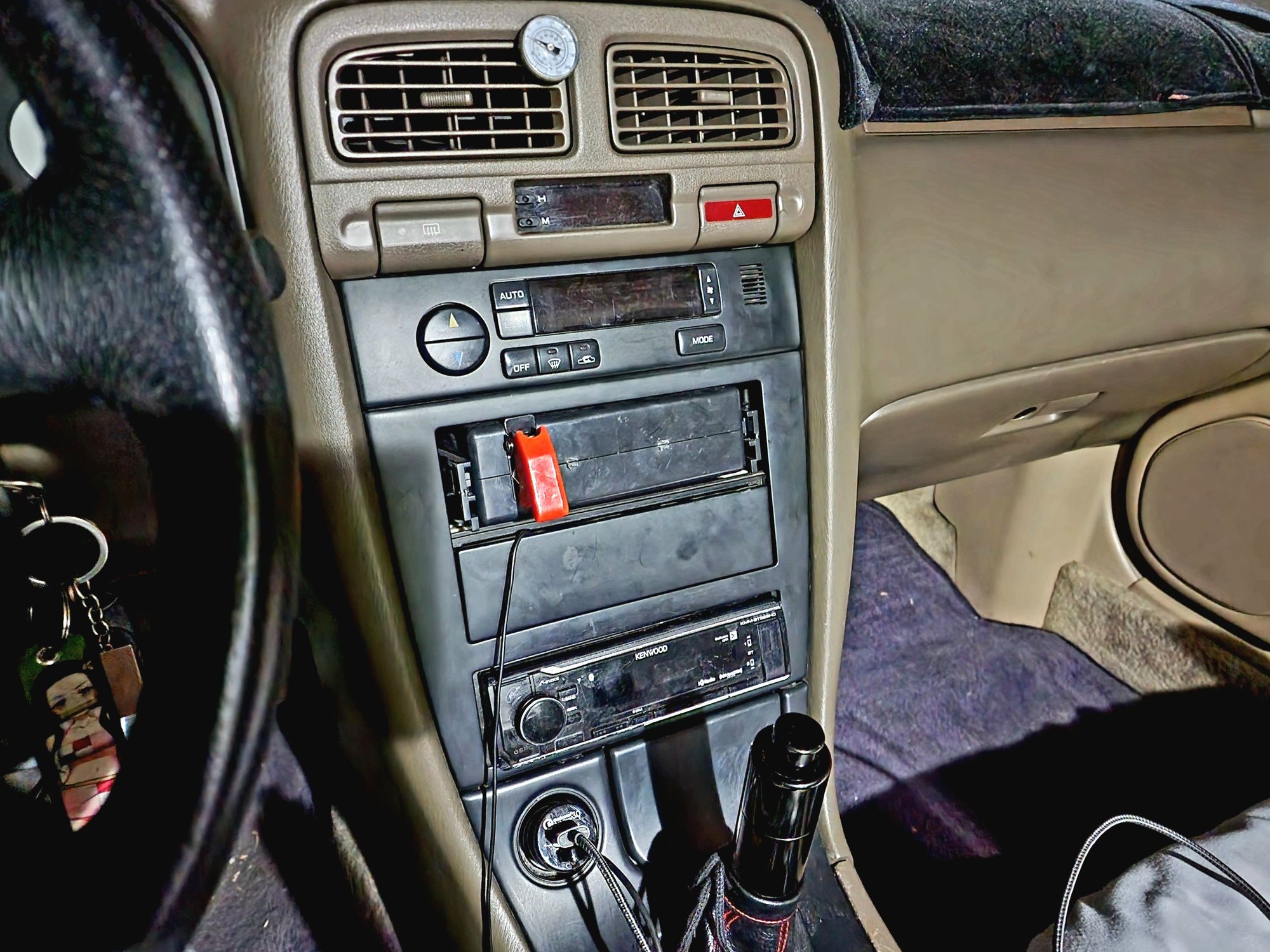 Aftermarket shifter w/ separate OD switch on the dash under the headunit Aftermarket steering wheel hub with quick release and 350mm deep dish wood steering wheel Will be getting a new hub from HKB Sport. Allows for the retention of clock spring, but later down the road.