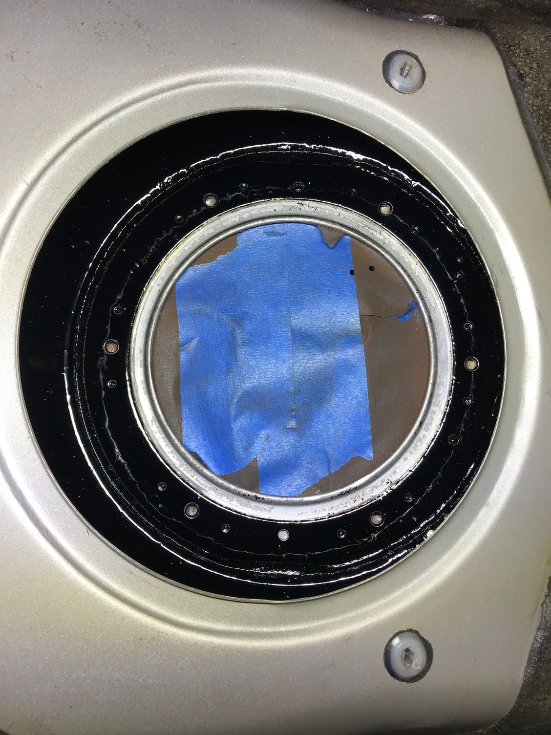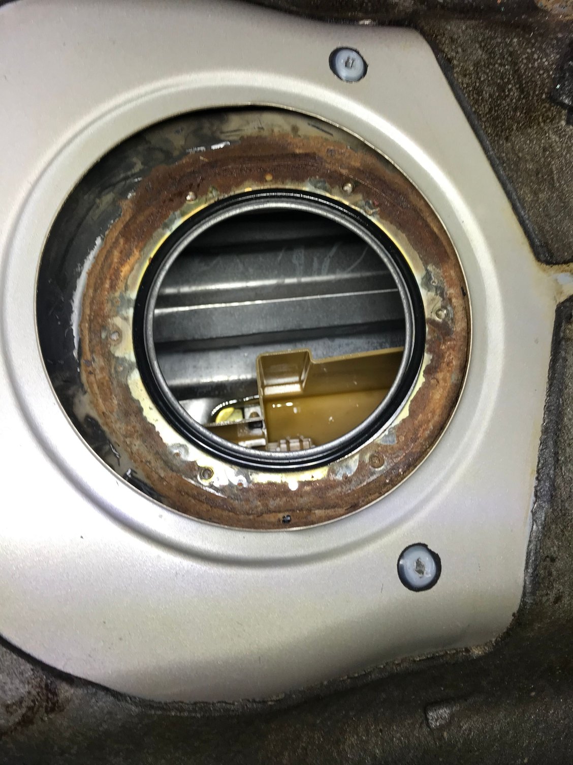 Still nice and clean on the inside Front cover before painting Filled in the scratch on the Front cover Front cover primed Front cover painted Metallic Gray Front cover painted Metallic Gray Modified rear cover (not smooth due to cutoff wheel) Modified rear cover (not smooth due to cutoff wheel) OEM crank pulley New under driver pulley