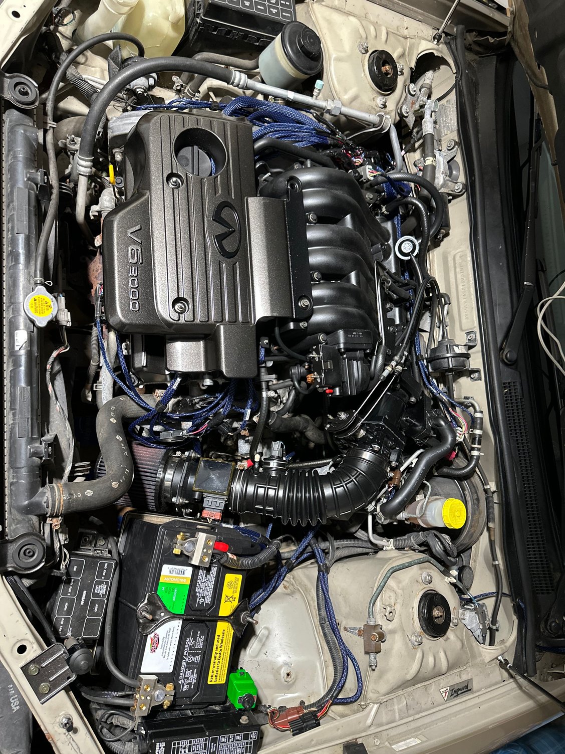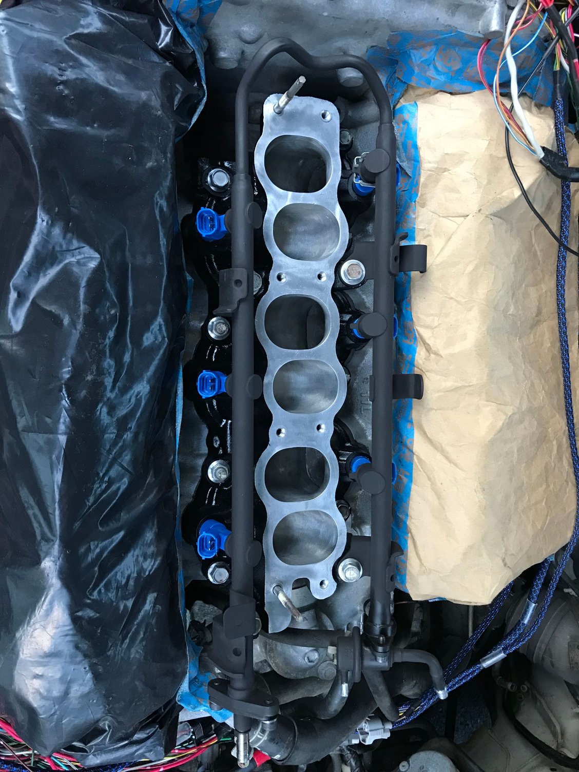 Most of the wiring is done. Just need to wrap it up. LIM with NWP spacers is now on and fuel rail with 550cc injectors as well. Pre-wired plug for Z32 MAF. Finished up with the engine cover, removed fittings off the 00VI and tapped on a larger one. Cleaned up top of fuel tankard plugs, replaced fuel lines and applied dielectric grease.