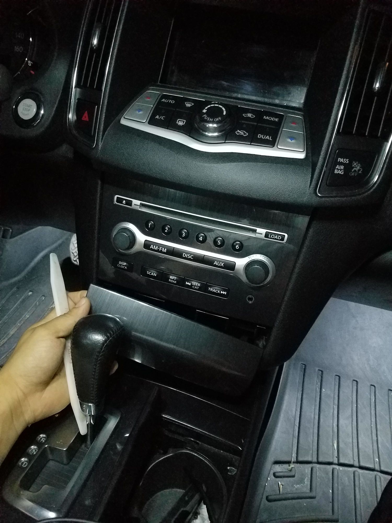 Removal of a 2014 nissan maxima stereo without bose system.... Use trim stick to remove panel under stereo and panel with vents above stereo. Disconnect the 3 harnesses connected to a/c unit. Stereo will have philips screws holding it in place.